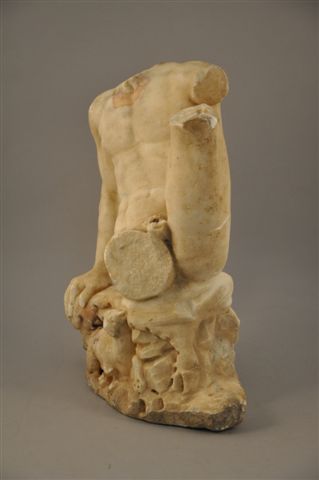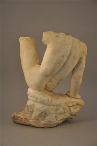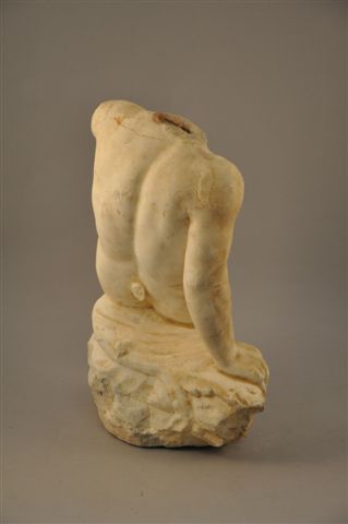 PARTIE d'une STATUE d'un homme assis sur un roche. Marbre blanc, à la base un lion.