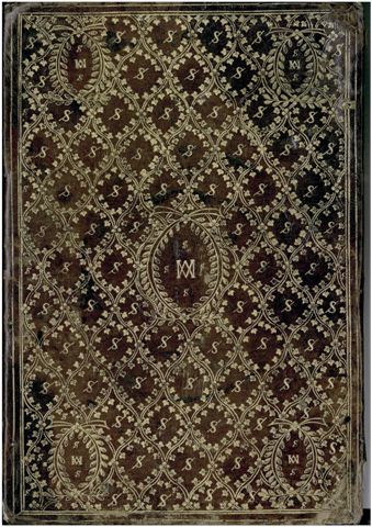Manuscrit en partie autographe, milieu du XVIe-milieu du XVIIe siècle ; petit in-fol. de 121 pages plus feuillets blancs, reliure fin XVIe s. en veau brun orné sur les deux plats de guirlandes de lierre dorées formant des croisillons autour de fermesses ou S barrés, et sur chaque plat de cinq médaillons ovales de branches de laurier au centre et aux quatre coins renfermant le monogramme MA enlacé, dos orné du monogramme et de fermesses en alternance, séparés par des doubles filets (reliure usagée: charnières fendues, petits accidents aux coiffes, aux coins, au dos et sur le plat inf.).