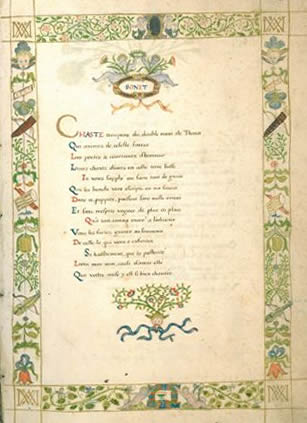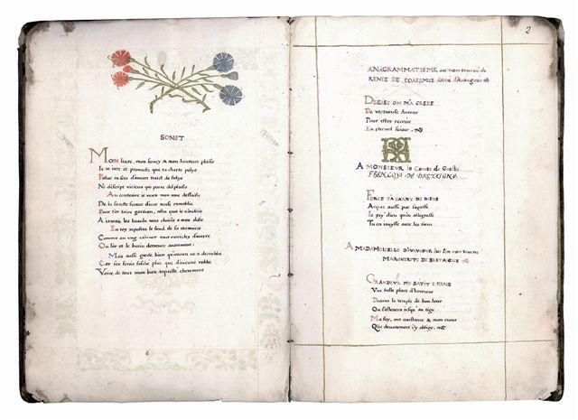 Précieux recueil autour d'une poétesse de la fin du XVIe siècle, très joliment décoré, renfermant aussi une histoire généalogique de la noble famille de Goulaine.