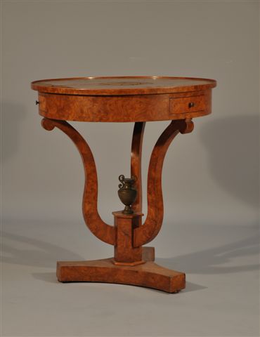 GUÉRIDON circulaire en placage de loupe, piètement tripode en forme de lyre, reposant sur une base patin. Il présente trois tiroirs. Vase en bronze patiné, sur socle hexagonal, à la base du piètement.