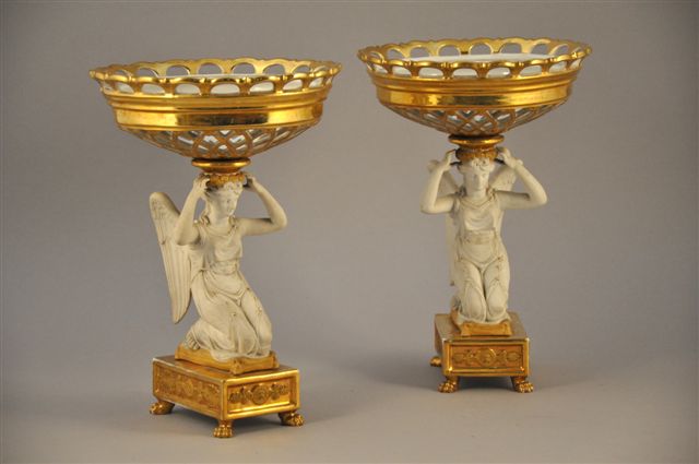 Paire de BOUQUETIÈRES en porcelaine et biscuit blanc et or aux anges agenouillés sommés d'une couronne ajourée, repose sur un socle aux frises de palmettes supporté par quatre pieds griffes.