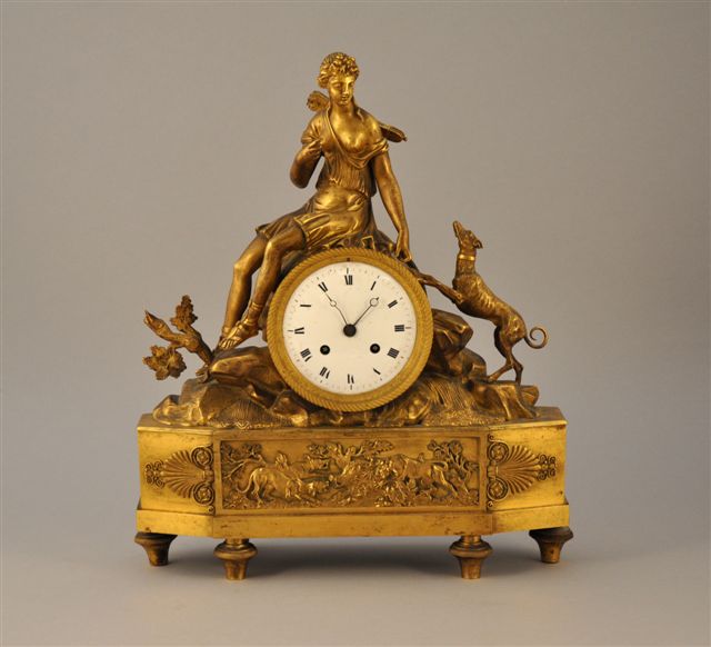 PENDULE "Diane Chasseresse" en bronze ciselé et doré. La déesse vêtue d'une courte tunique, un sein nu, porte un carquois, un lévrier l'accompagne, elle est assise sur un rocher où est inscrit le cadran.