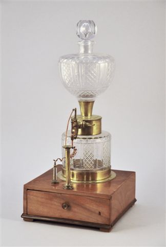 Rare BRIQUET à hydrogène. Composé de deux réceptacles en cristal taillé, l'un avec bouchon, à côtes et croisillons, monture et mécanisme en bronze et laiton. Base quadrangulaire en acajou avec tirette.