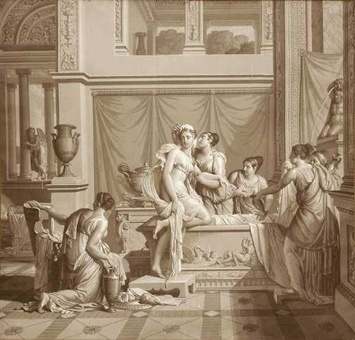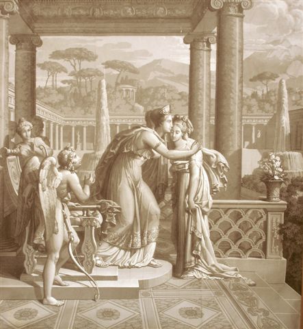 Cinq scènes sur les douze s'inspirent des gravures de Gérard (BN, Est., Dc 55a f° 72) pour l'édition Didot et une de Prud'hon, Psyché enlevée par les Zéphyrs. L'attribution, par Clouzot, de la composition du décor à Blondel et Laffitte, qui ont probablement servi d'intermédiaires entre l'oeuvre de Gérard ou Prud'hon et le papier peint, repose sur deux dessins provenant de la famille Dufour.