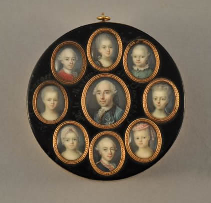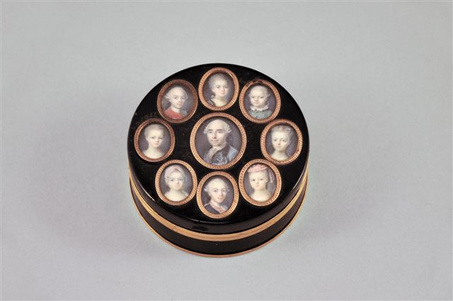 BOÎTE en écaille et cerclage or, ornée de neuf miniatures sur ivoire de la famille du Marquis de Sourches.
