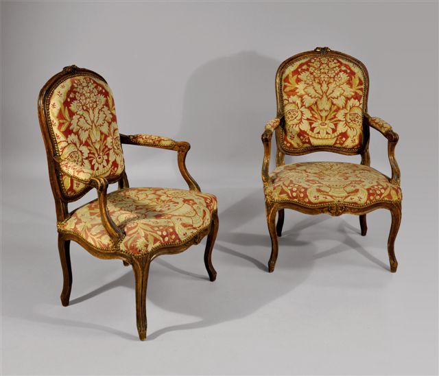 PAIRE de FAUTEUILS à dossier plat "à la Reine" en hêtre mouluré et sculpté de fleurs sur le haut du dossier et sur la ceinture. Pieds et supports d'accotoirs cambrés et nervurés.
