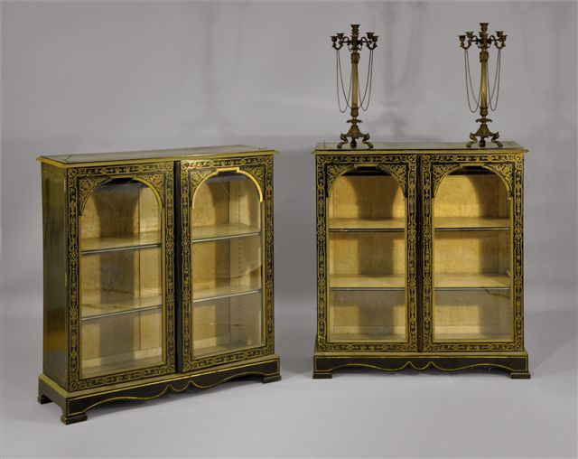 PAIRE de VITRINES basses en bois noirci et marqueterie dite Boulle. Elle ouvre par deux portes vitrées en façade. Forme mouvementée du tablier sur la traverse basse, repose sur quatre pieds rectangulaires. Décor à la Berain constitué de lambrequins, d'animaux, de rinceaux fleuris et de mascarons.