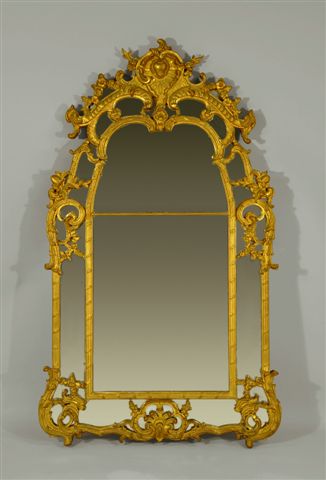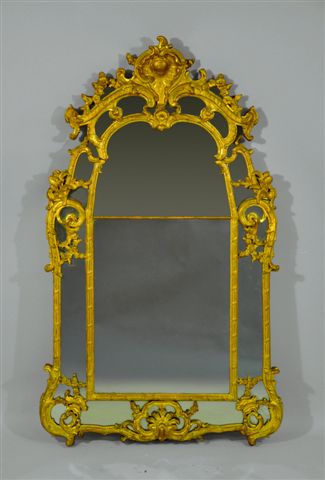 Deux MIROIRS à parecloses pouvant former paire en bois sculpté et plâtre doré. Le fronton orné d'une coquille et de godrons, l'encadrement de guirlandes de fleurs et de rinceaux feuillagés, la base figurant une palmette stylisée.