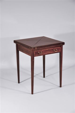 TABLE À JEU dite "table mouchoir" en acajou et placage d'acajou, ornement de filets de bois clair. Elle ouvre à un tiroir en ceinture, le dessus se déploie pour dégager le tapis de jeu, aux angles du plateau des cavités pour les jetons. Pieds fuselés, poignées de tirage en bronze doré.