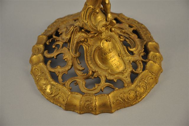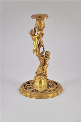 BOUGEOIR en bronze ciselé et doré. Le socle chantourné à décor ajouré de rinceaux, marqué dans un cartouche "à Léonie, souvenir", le fût d'esprit rocaille animé de deux putti grimpant.