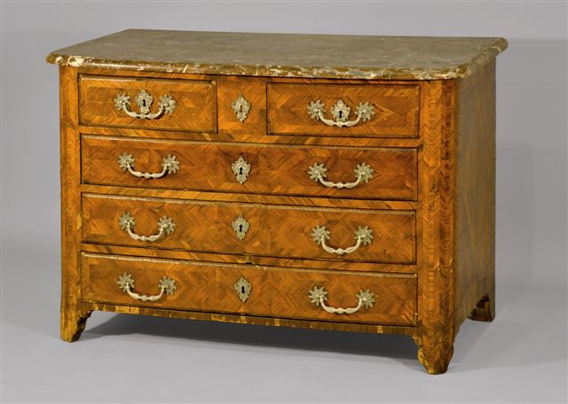 COMMODE en placage de bois de violette à marqueterie géométrique, ouvrant à cinq tiroirs sur quatre rangs, les montants arrondis.
