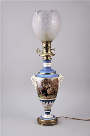LAMPE à pétrole en porcelaine polychrome et biscuit. Sur un socle circulaire en bronze doré orné sur le pourtour d'une frise d'entrelacs et de fleurettes, repose un vase sur piédouche à fond bleu et rehauts d'or décoré d'un côté d'une scène galante champêtre et de l'autre des attributs de l'Amour. Le vase est flanqué de mascarons à tête de faune en biscuit, surmonté d'une ornementation en bronze doré et d'un globe en cristal gravé de frises de grecques et de fleurs dans des mandorles.