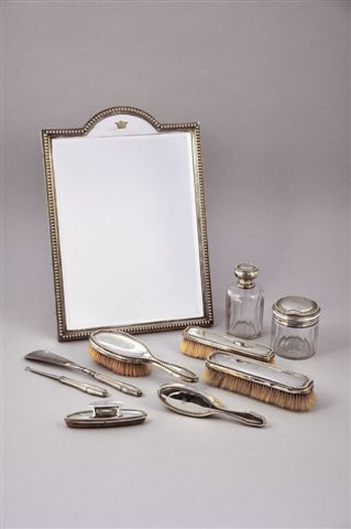 NÉCESSAIRE DE TOILETTE de neuf pièces comprenant un flacon à parfum et un pot à fard en cristal taillé à pans, quatre brosses à habits et à chaussures, un chausse-pied et un nécessaire à manucure.