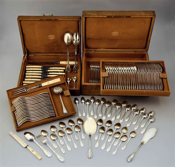 MÉNAGÈRE en argent, modèle à tores de lauriers et feuilles d'acanthe, comprenant dix-huit couverts et dix-huit fourchettes de table, dix-huit couverts à dessert, vingt pelles à glace (dont deux au cuilleron d'un modèle différent), un couvert à salade, une saupoudreuse, un couvert à poisson et seize cuillères à café. L'ensemble monogrammé " K C ". Poinçon Minerve.