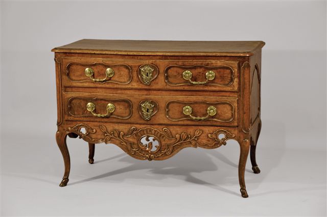 COMMODE en noyer mouluré et sculpté, ouvrant à deux tiroirs, traverse inférieure ajourée, repose sur quatre pieds cambrés se terminant par des sabots de cervidé. Poignées de tirage et entrées de serrures en bronze.
