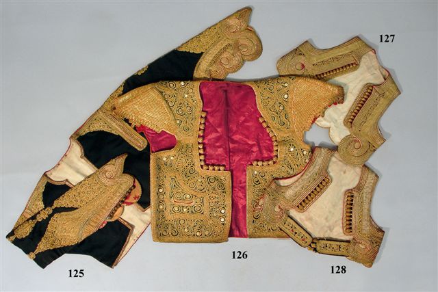 Petit GILET, Turquie ou Grèce ottomane, XIXème siècle, feutre noir densément brodé or de fleurs et rinceaux, boutons figurés, doublure d'un coton imprimé cachemire.