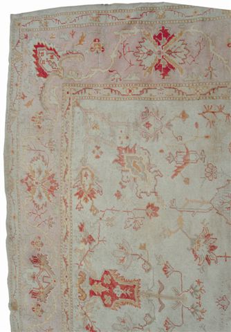 Le tapis est agrémenté d'un élégant décor floral stylisé sur un fond ivoire. Une bordure rose à motifs géométriques est encadrée de deux contre bordures.