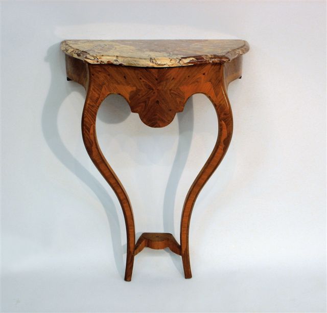 CONSOLE d'APPLIQUE mouvementée en bois de placage dans des encadrements de filets. Elle repose sur deux pieds cambrés réunis par une petite entretoise.