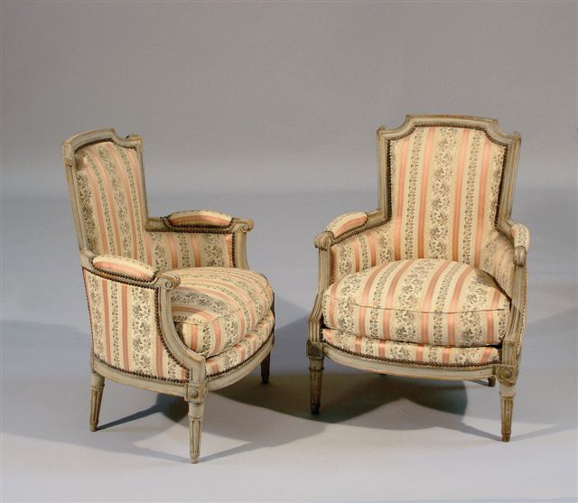 Rare PAIRE de BERGÈRES d'ENFANT, en bois peint gris bleuté mouluré et sculpté. Dossier cabriolet à chapeau de gendarme. Accotoirs à manchettes se terminant en enroulements. Supports d'accotoirs nervurés. Pieds droits, cannelés et fuselés.