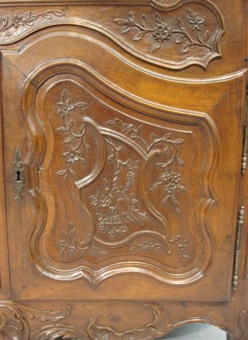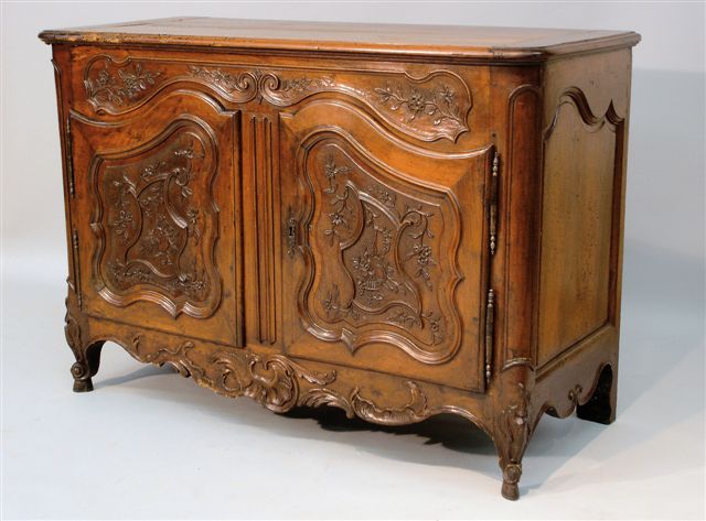 Le XVIIIème siècle constitue l'âge d'or du mobilier provençal. Les formes Louis XV à panneaux chantournés, larges moulures et pieds galbés envahissent alors les meubles. Les fustiers, ces menuisiers ébénistes des villes du Midi, s'inspirent des formes créées par les ornemanistes pour mettre au point un répertoire iconographique où les fines sculptures de motifs floraux et végétaux donnent au mobilier toute son élégance. Ce buffet constitue un bel exemple de ce travail qui, loin des modèles parisiens, a su inventer son propre langage. La sculpture est ici omniprésente: elle habille la ceinture, les vantaux, les montants et les pieds. Les branches fleuries voisinent avec les volutes, et les attributs de la campagne avec les coquilles rocailles. Une richesse toute baroque qui reste, cependant, maîtrisée par un sobre jeu de moulurations en creux et en relief sur les deux vantaux et les côtés.