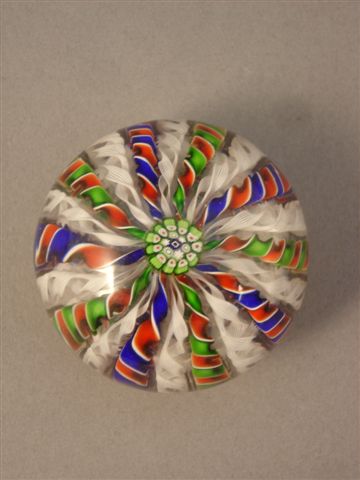 BOULE PRESSE-PAPIERS en cristal, ornée au centre de millefiori verts, entourés de filigranes torsadés blancs et polychromes.
