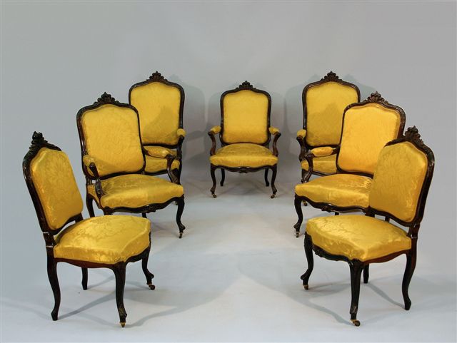 MOBILIER de SALON NAPOLÉON III, de style Louis XV, en bois de palissandre et placage de bois exotique. Il comprend sept pièces: cinq fauteuils à la Reine dont deux grands et trois plus petits, deux chaises. Riche mouluration et sculpture de feuilles d'acanthe sur le dossier et la ceinture. Accotoirs à manchettes se terminant en enroulements ornés d'une feuille d'acanthe, reposant sur des consoles en coup de fouet. Pieds antérieurs galbés et nervurés, décorés d'une acanthe stylisée, et reposant sur des roulettes. Pieds postérieurs légèrement galbés. Recouvert d'un damas jaune à décor floral.