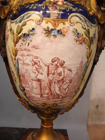 PAIRE de CANDÉLABRES en bronze ciselé et doré à neuf lumières. Ils sont formés d'un vase ovoïde en faïence polychrome et d'une monture en bronze doré. La panse est ornée, sur une face, d'un large médaillon contenant une scène galante où un couple s'enlace sous le regard coquin de petits Amours. La seconde face est décorée d'attributs musicaux. Elle s'appuie sur un piédouche bagué ciselé d'une frise de feuilles d'acanthe. Sur l'épaulement de chacun des vases, une paire de bustes de femmes drapées à la grecque souligne les anses ajourées de style Louis XVI. Base en forme de colonne tronquée en marbre rouge griotte, cannelée à décor de feuilles de laurier, rang de perles et frise d'entrelacs en bronze doré.