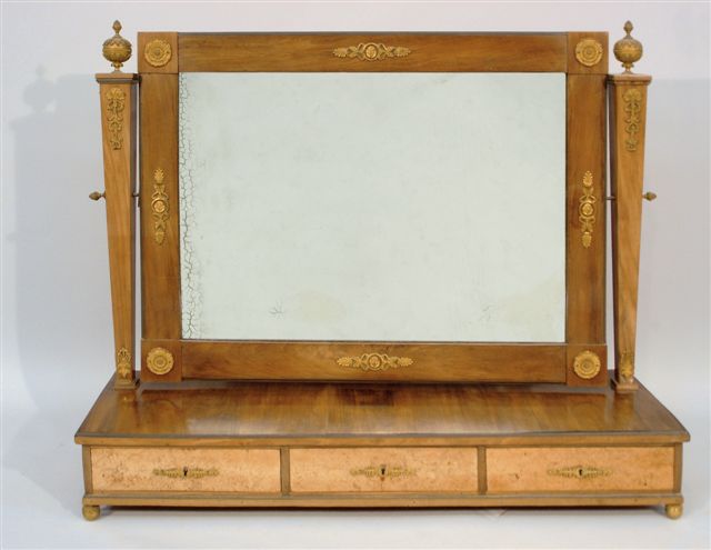 COIFFEUSE en bois de placage. Partie haute composée d'un miroir encadré par deux gaines surmontées de motifs décoratifs tels que globe et artichaut. Partie basse comprenant trois tiroirs en loupe d'érable sur un rang. L'ensemble repose sur des pieds boule. Ornementation de bronzes dorés tels que entrées de serrure, pieds, encadrement du miroir et gaines.