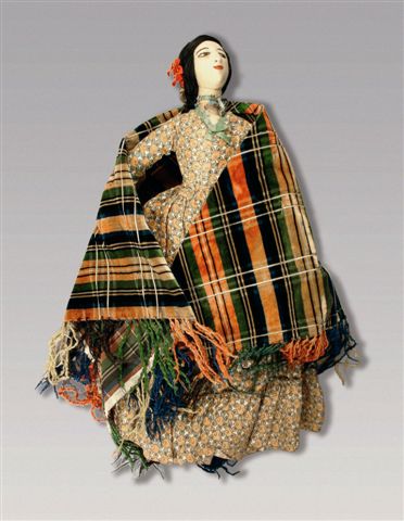 Deux POUPÉES en tissu, l'une habillée en gitane avec un châle, l'autre en Sévillane avec une mantille, signées et datées 1916 sur la cuisse gauche.