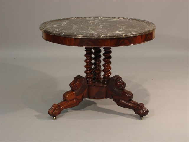 GUÉRIDON en acajou et placage d'acajou. Le plateau repose sur trois colonnes torsadées, au milieu desquelles se trouve un élément spiralé surmonté d'une toupie. Piètement tripode à têtes de lion stylisées terminées par des pieds griffes.