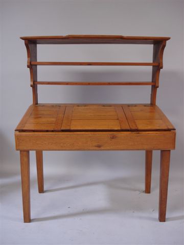 BUREAU PUPITRE à combinaisons en chêne. À la partie supérieure, un gradin de deux étagères. Le plateau se présente en plan incliné, avec système à abattant. Trois panneaux découvrent, dans la partie centrale, une niche. Il repose sur quatre pieds droits.