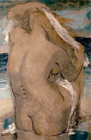 Toile signée en bas à gauche, titrée "Baigneuse" et datée 1970 au verso.