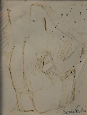 Joint une étude préparatoire du tableau: Femme se coiffant, fusain sur papier calque (?), signé en bas à droite. 10,5 x 8 cm.