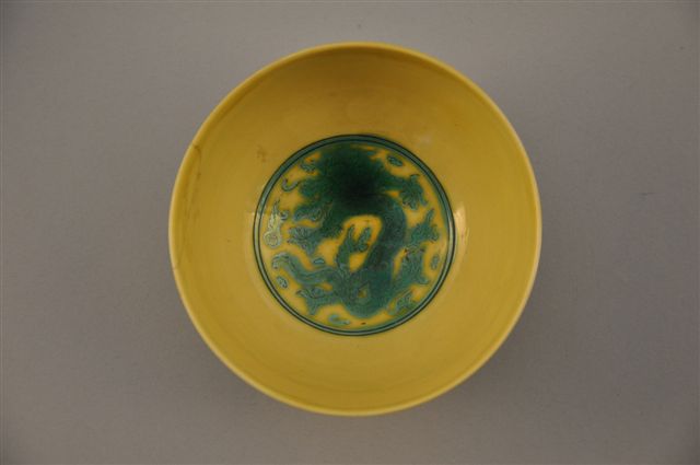 Paire de BOLS en porcelaine émaillée jaune, à décor gravé et émaillé vert de pêches de longévité et frises de lingzhi et motifs géométriques. Au revers de la base la marque Kangxi émaillé brun à six caractères.