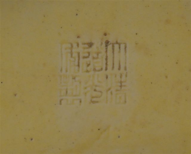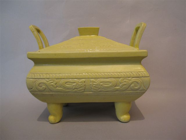 BRÛLE PARFUM de forme rectangulaire en porcelaine émaillée jaune, décorée en relief de dragons affrontés stylisés. Au revers du couvercle l'inscription "brûle parfum de la famille Zhou". Au revers de la base la marque Daoguang en zhuanshu gravé sous la couverte.
