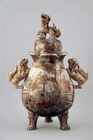 BRÛLE PARFUM tripode et couvert en faïence de Satsuma décorée en émaux polychromes de rakan, les anses et la prise du couvercle en forme de chimères.