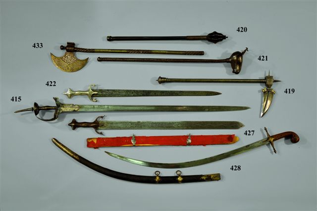 SABRE Oriental dit Quilidj. Poignée en crosse de pistolet, en bois teinté (postérieur). Garde à deux quillons droits et oreillons damasquiné d'or. Lame courbe, à dos rond, poinçonnée d'un lion au talon. Fourreau en bois à deux garnitures et deux bracelets en fer damasquinés d'or en suite.