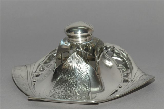 ENCRIER en ARGENT massif, forme et décor art Nouveau. Pour un godet encrier en cristal, avec couvercle charnière.