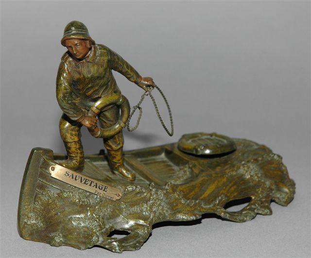 ENCRIER en RÉGULE à patine verte et ocre sur le thème du sauvetage en mer, le godet encrier à couvercle charnière est sous la bouée. A tribord il porte les initiales