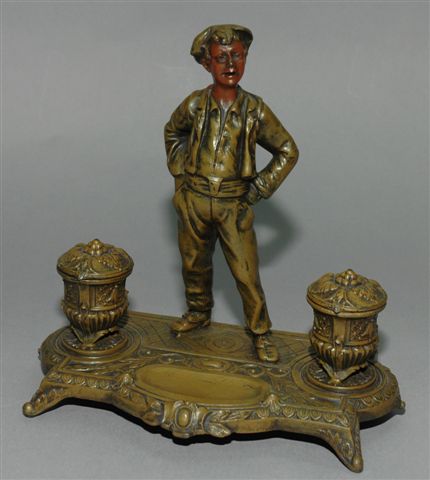 ENCRIER en RÉGULE à patine verte d'un jeune gavroche avec deux porte godets encriers à couvercle charnière.