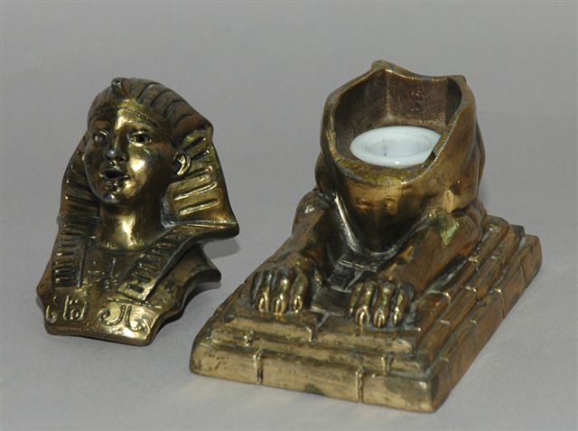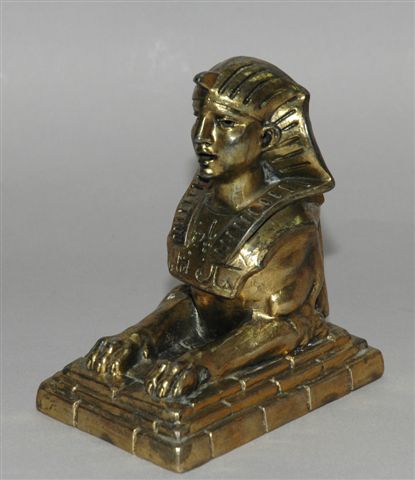 ENCRIER en RÉGULE à patine dorée figuratif du sphinx qui à l'ouverture de la partie supérieure révèle le godet encrier en porcelaine.