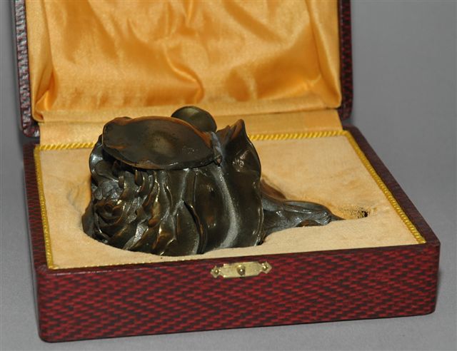 ENCRIER N III d'une pivoine en RÉGULE à patine bronze doré dans son écrin d'origine. Au centre le godet encrier en verre est dissimulé sous un pétale couvercle charnière.
