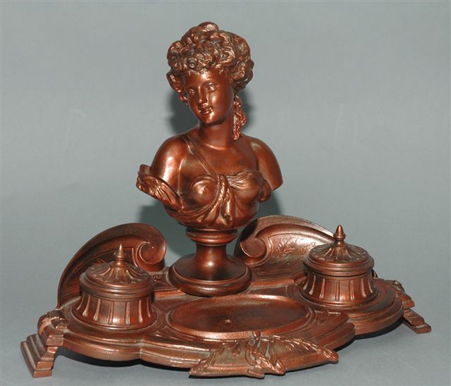 ÉCRITOIRE époque N III en RÉGULE à patine cuivrée rouge pour deux godets encriers sous couvercle charnière. Sur plateau ovoïde à dosseret à volutes encadrant un buste de jeune femme représentative de "La Connaissance" accompagnée des attributs symboliques que sont une mappemonde, un livre et la plume d'oie et une lyre. Au revers marqué AB et 243