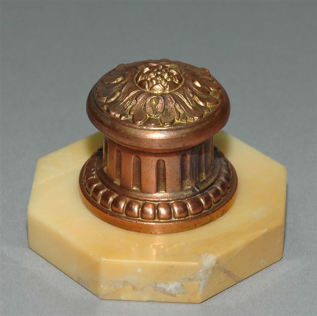 ENCRIER en RÉGULE à patine cuivrée rouge pour un godet encrier sous couvercle charnière, au centre d'une base octogonale en marbre jaune de Sienne.