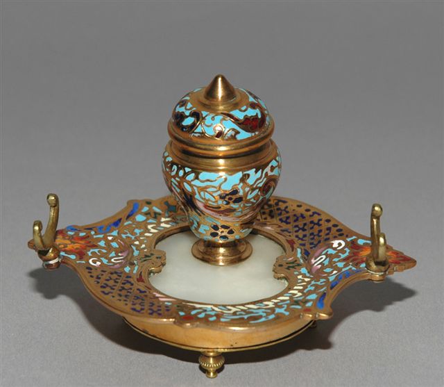 ENCRIER en ÉMAUX CLOISONNÉS (champlevé). Pour un godet encrier à couvercle charnière sur plateau albâtre enchâssé avec griffes repose plume.