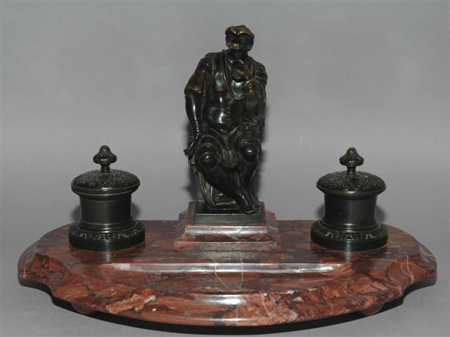 ÉCRITOIRE, sur une base en marbre griotte rouge dite d'Italie. Le sujet central de l'écritoire reproduit la statue de Laurent de Médicis sur son tombeau à Florence par Michel-Ange, en BRONZE PATINÉ. L'écritoire offre deux portes godets cylindriques pour encriers ronds en cristal.