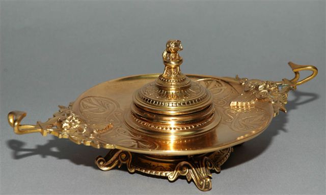 ENCRIER Art Nouveau en BRONZE DORÉ, sur un plateau circulaire à deux anses recourbées. L'encrier positionné au centre est en cristal bleu dans son porte godet à couvercle charnière. Décor floral et prise en fleur bouton de pavot entouré d'un serpent.