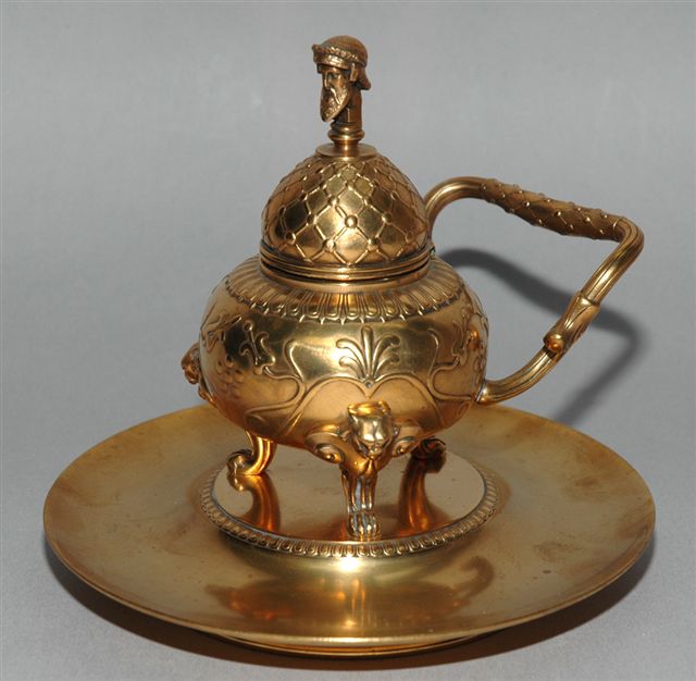 ENCRIER d'inspiration antique en BRONZE DORÉ, sur plateau coupelle circulaire. L'encrier positionné au centre est en verre dans son porte godet en forme d'urne reposant sur trois pieds griffes à têtes de chimères, offrant une anse griffe pose plumes. Le couvercle en forme de coupole à croisillons est surmonté d'une prise tête étrusque.