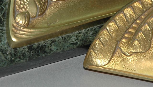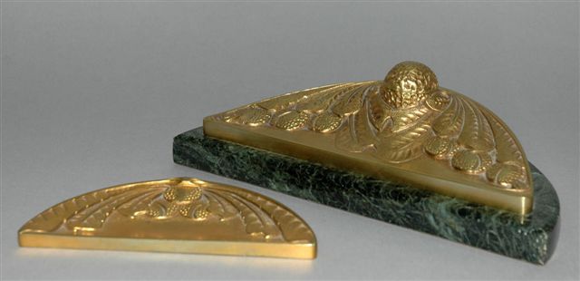 PARURE en BRONZE DORÉ composée d'un encrier Art Nouveau sur base demi cercle en marbre vert et d'un presse papier. Le décor est à feuilles de marronnier et de bogues dont celle placée au centre révèle le godet encrier sous couvercle charnière.