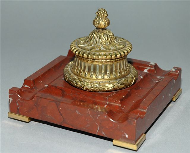ENCRIER cylindrique N III en BRONZE DORÉ sur une base carrée en marbre rouge du languedoc. Au centre le godet encrier est sous couvercle charnière feuillagé à prise pomme de pin.